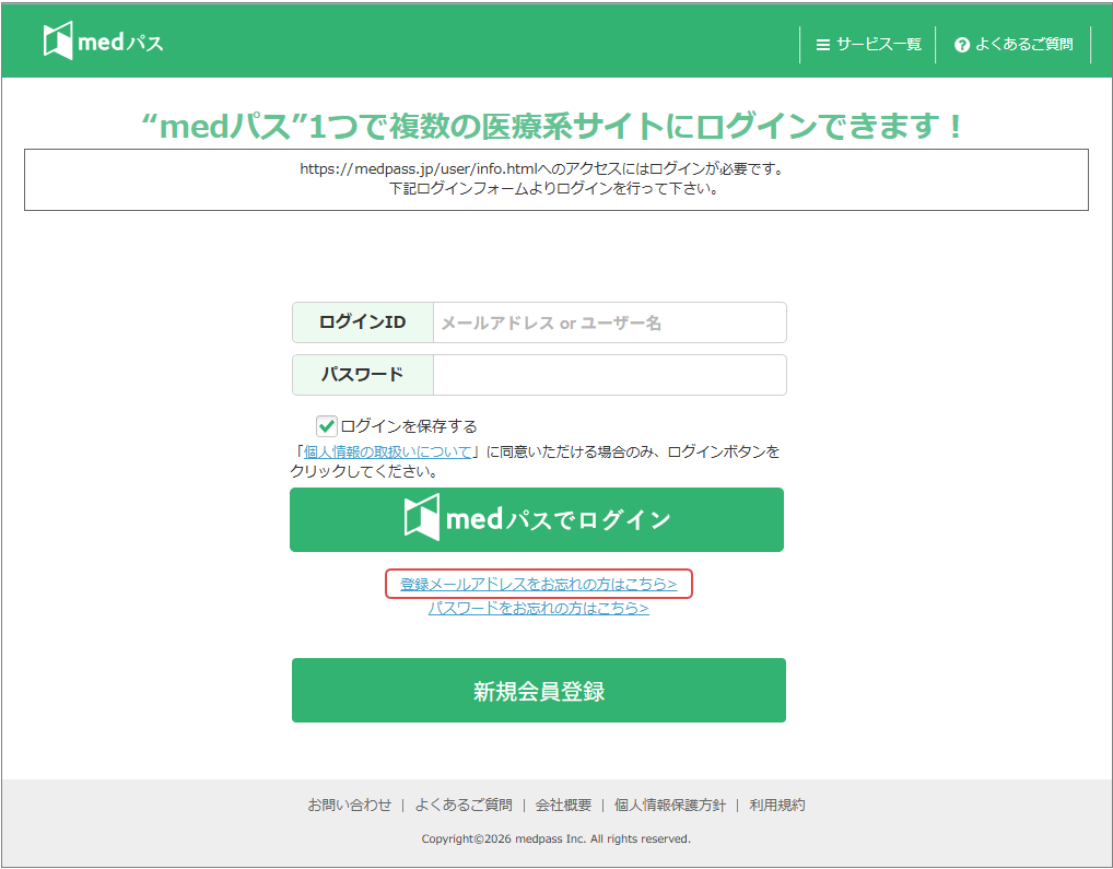 - medパスログイン画面が表示されたら、「登録メールアドレスをお忘れの方はこちら>」リンクをクリックします。