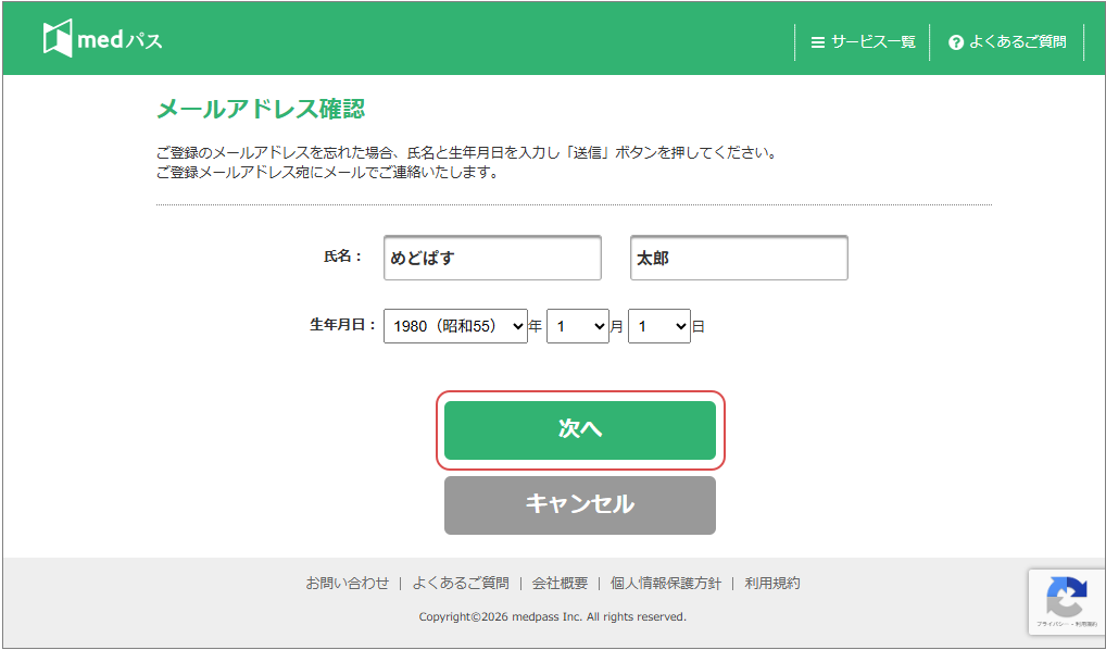 - メールアドレス確認画面が表示されましたら、medパスに登録済みの氏名、生年月日を入力し「次へ」ボタンを押下します。