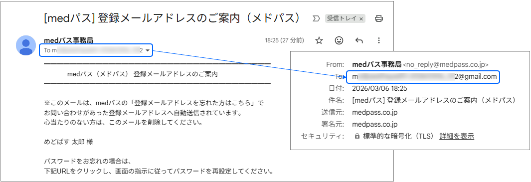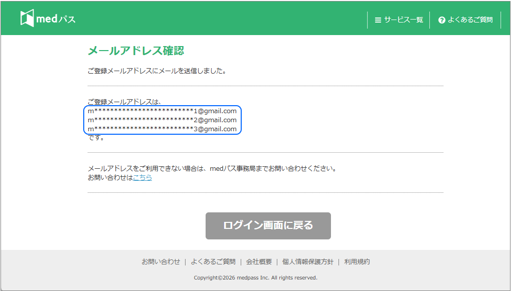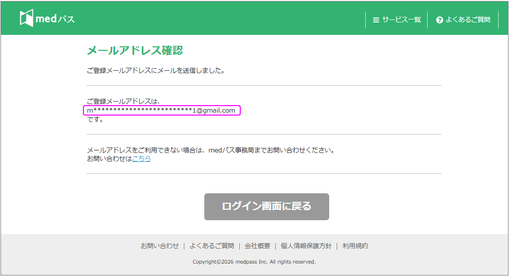 - medパスに登録のあるメールアドレスが表示されます。(@前までの最初と最後の一文字、@以降を表示し、その他は伏字で表示いたします。)